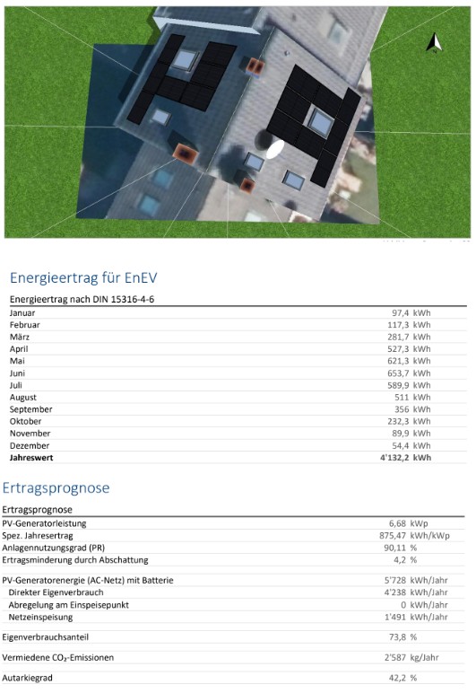 Mit 15 nach Südost und Nordwest ausgerichteten Solarmodulen, erzielt die Anlage in Bochum durch einen kalkulierten spezifischen Ertrag von 875,47 kWh/kWp einen Jahresertrag von 4’132,2 kWh Strom. Der Jahresstromverbrauch von 10000 kWh wird durch den soliden 42,2 % Autarkiegrad abgedeckt.