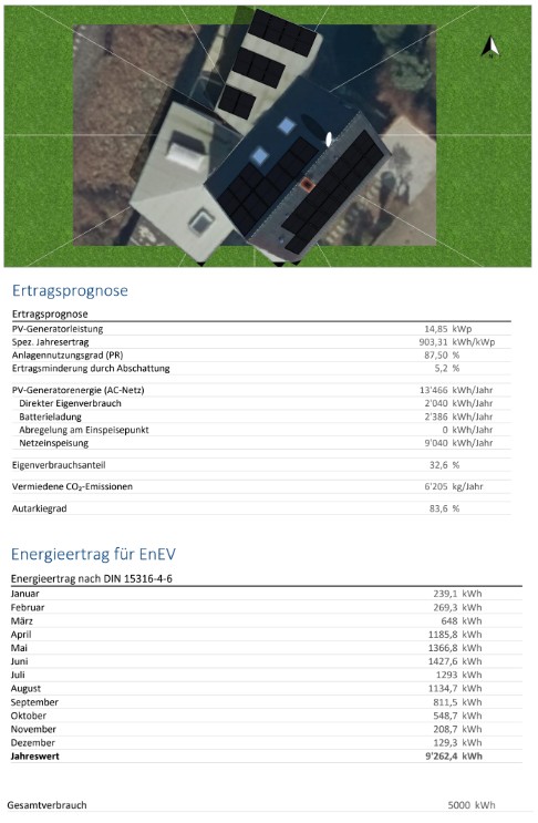 Der jährliche Stromverbrauch liegt im höheren Bereich bei 5000 kWh und der Autarkiegrad liegt bei 83,6%. Dadurch zieht der Kunde 16,4%, also 820 kWh seines Eigenverbrauchs aus dem Stromnetz.