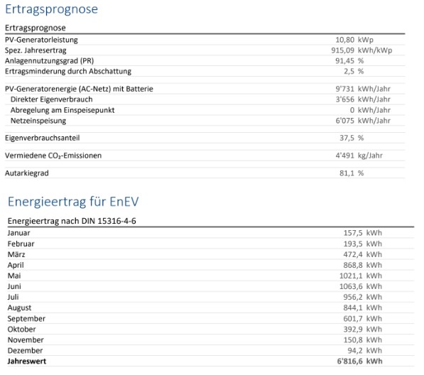 Bei einem Autarkiegrad von 81,1% umfasst diese auf der Nordost- und Südwestseite installierte Photovoltaikanlage 24 Module von Bauer Solar mit je 450 W und erreicht eine Gesamtleistung von 10,8 kWp mit einem spezifischen Ertrag von 915,09 kWh/kWp.