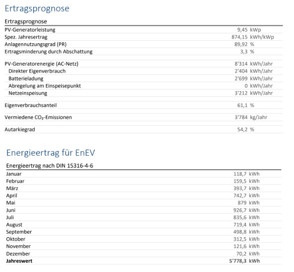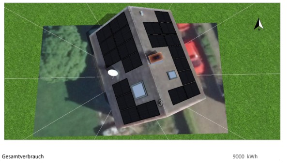 Der jährliche Stromverbrauch des Kunden liegt bei 9000 kWh (inkl. Wärmepumpe) und der Autarkiegrad bei 54,2 %, das bedeutet, der Kunde spart 54,2 % seines Eigenverbrauchs und zieht 45,8% aus dem Stromnetz!
