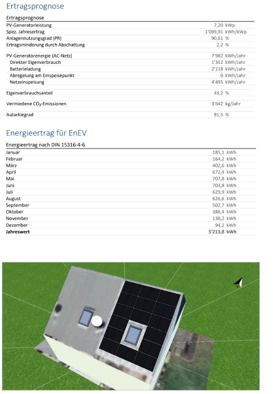Die im Süden installierte Photovoltaikanlage umfasst 16 Module von JA Solar mit jeweils 450 W und erreicht eine Gesamtleistung von 7,2 kWp. Mit dieser Ausrichtung erzielt sie einen spezifischen Ertrag von 1’099,91 kWh/kWp und ermöglicht einen Autarkiegrad von 81,5 %!