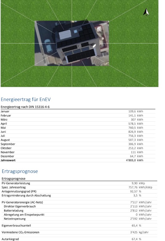Dieses System erreicht einen Autarkiegrad von 67,4 % und bei einem jährlichen Verbrauch von ca. 7.000 kWh, das bedeutet, der Kunde spart 67 % des Energiebedarfs und zieht 33 % also 2.310 kWh aus dem Stromnetz. Ergänzt wird die Anlage durch einen 8-kW-Wechselrichter sowie einen 10-kWh-Batteriespeicher von GoodWe.