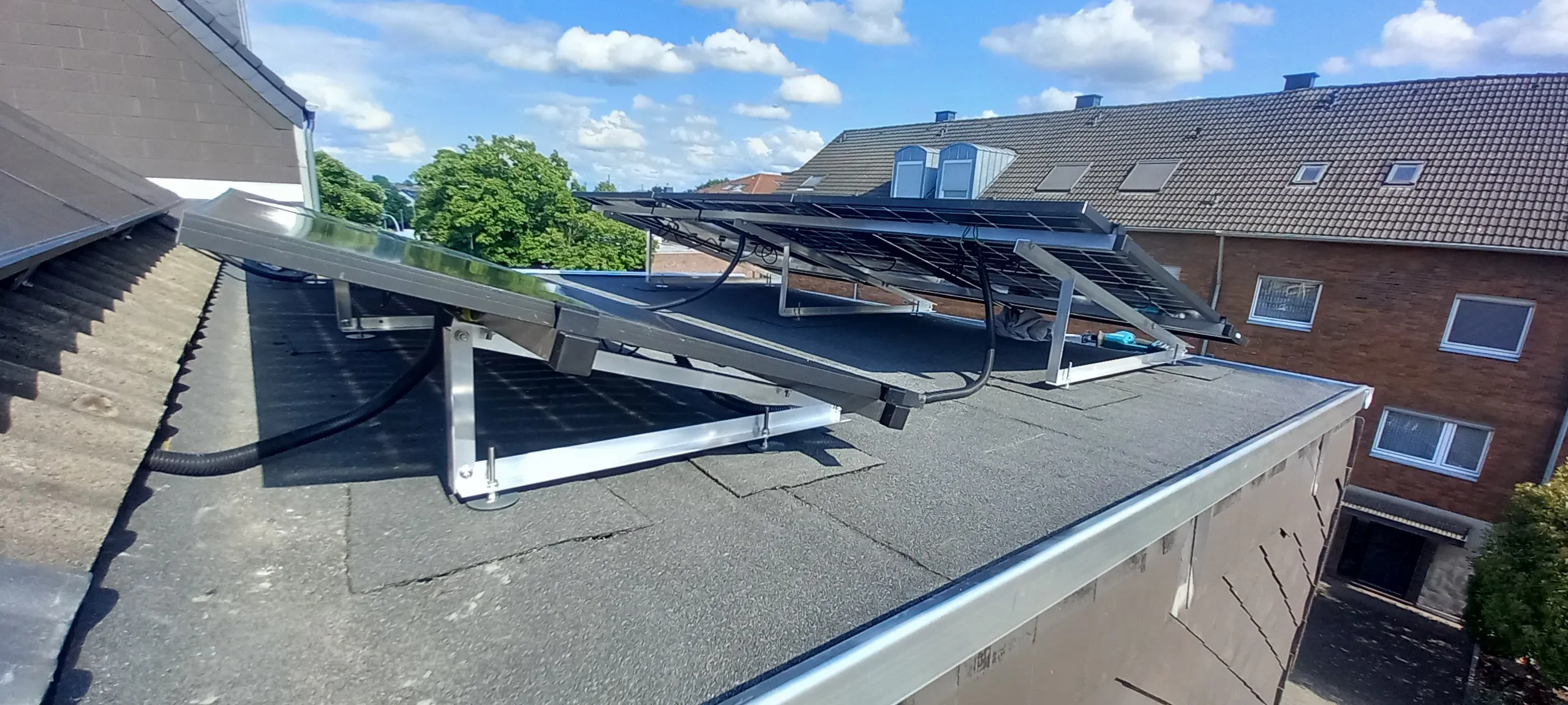 In dieser Simulation erzeugen 14 Bauer Solar Module mit Südausrichtung auf einem Flachdach 6,23 kWp. Für die optimale Ausrichtung wurden teilweise spezielle Unterkonstruktionen eingesetzt. So erzielt die Anlage eine hohe spezifische Leistung von 853 kWh/kWp.