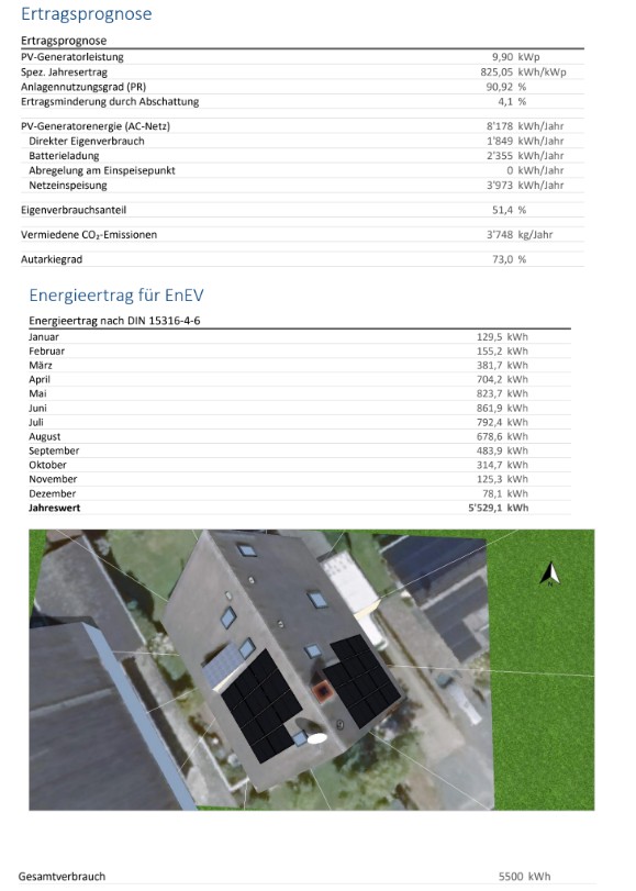 Mit 22 nach Südost und Nordwest ausgerichteten Solarmodulen des Herstellers JA Solar, erzielt die Anlage in Voerde durch einen kalkulierten spezifischen Ertrag von 825,05 kWh/kWp einen Jahresertrag von 8’178 kWh Strom. Der Jahresstromverbrauch von 5500 kWh wird durch den starken 73 % Autarkiegrad abgedeckt.